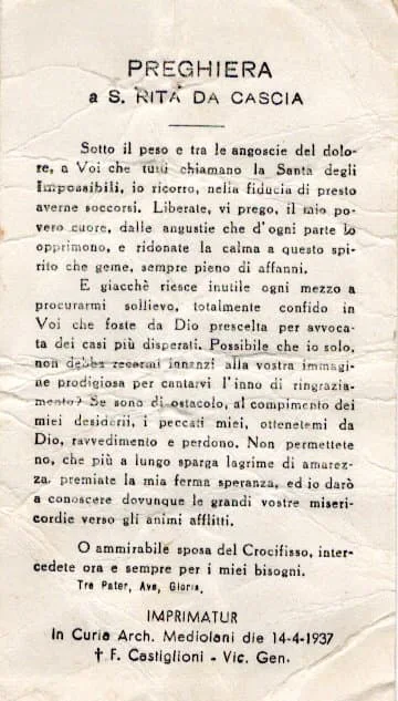 Questa preghiera è un atto di abbandono e fiducia in Dio attraverso l’intercessione di Santa Rita, modello di pazienza e perseveranza nella fede.