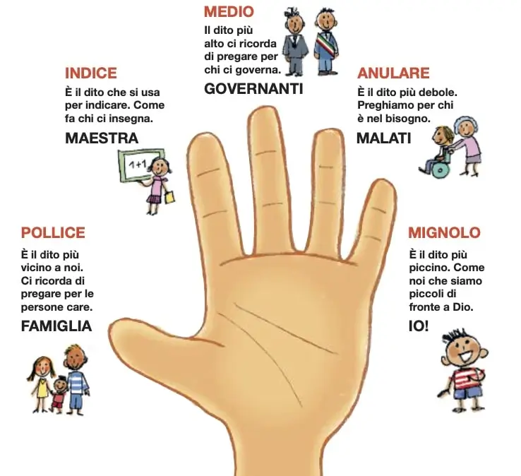 - Il pollice รจ il dito a te piรน vicino. Comincia quindi col pregare per coloro che ti sono piรน vicini. Sono le persone di cui ci ricordiamo piรน facilmente. Pregare per i nostri cari รจ “un dolce obbligo”.